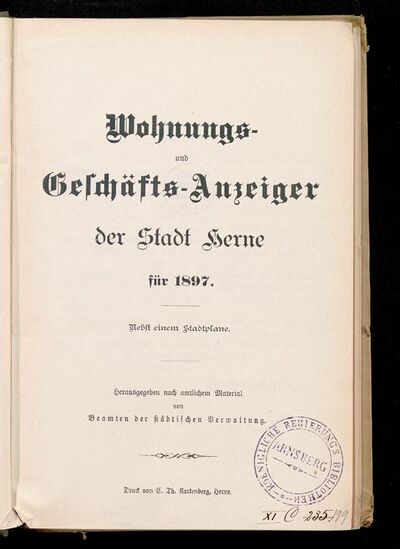 - Wohnungs- und Geschäfts-Anzeiger der Stadt Herne : für 1897 ; herausgegeben nach amtlichem Material von Beamten der städtischen Verwaltung ;