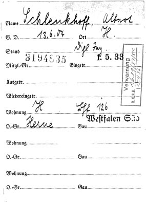 - Landesarchiv NRW Abteilung Rheinland - NW 1102 / SBE Hauptausschuss Stadtkreis Herne NW 1102, Nr. 554 - (554) Entnazifizierung Albert Schlenkhoff , geb. 13.06.1904 (Geschaeftsfuehrer)
