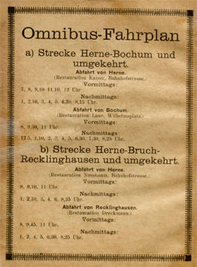 Von Herne nach Recklinghausen waren die Abfahrtszeiten folgende 8, 9 , 10, 11, 1, 2:10, 3, 4, 6 und 8.25 Uhr. Die Abfahrt geschah von der Restauration Nußbaum (jetzt Schauburg). Zurück fuhren folgende Wagen von Recklinghausen ab Restaurant Dreckmann um 8, 9:45, 11. 1. 2. 4- 5, 6,30 und 8.25 Uhr.