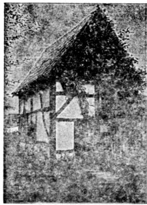 Die nächste Abbildung zeigt das alte Wohnhaus vom sogen. Nocken=Dierk (Dietrich Nocke). Es stand bis vor einigen Jahren an der Stelle, wo sich jetzt der Heiland'sche Neubau in Alt-Herne erhebt. Das Haus ist, im Gegensatz zu den beiden vorher gezeigten, Großkötterhaus, da es mit einer großen Toreinfahrt versehen war, um den Erntewagen durchzulassen. Wie bei allen gezeigten Bauernhäusern bestanden die Wände aus Lehmstakung mit Kalkmörtel. Der Giebel war verschalt und zur Erzielung einer Schattenwirkung mit Brettern abwechselnd hell und dunkel gestrichen. Für die Herstellung des Holzfachwerks, der Streben usw. wurden Naturhölzer verwandt, wie sie sich im Walde gerade boten. Der Fußboden war ursprünglich in Lehm gestampft.
