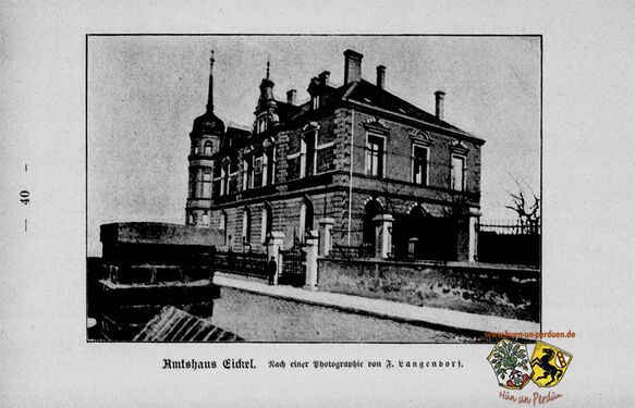 Nach der Besichtigung dankte er der Amtsvertretung mit herzlichen Worten für das bereitwillige Entgegenkommen beim Baue der Amtsräume und der Wohnung für den Amtmann. Herr Landrath Dr. Hammerschmidt schloss sich diesem Danke an mit dem Wunsche, dass das Haus eine Stätte echter Gottesfurcht, glühender Vaterlandsliebe und treuer Pflichterfüllung werden, und dass ferner so schnell und prächtig wie der stattliche Bau sich auch das Amt Eickel entwickeln möge.