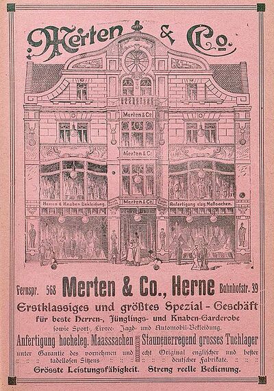 Der Doppelbau ehemals Nr. 39 bzw. 39b war der rechte Teil, an dem man noch einen kleinen Teil (ganz rechts am Haus) der ursprünglichen Jugendstilfassade des Konfektionshaus Mertens & Co im Hause Bahnhofstraße 39 erkennt. 1892-1899 stand hier das Haus des Kaufmanns Leopold Weinberg. 1910 wurde es neu errichtet, und so ist im Adressbuch nicht verzeichnet. Das Konfektionsgeschäft Voorgang zog nun hier ein. Mertens & Co wechselten ins neue Haus Bahnhofstraße 54 und ging 1929 bankrott[1]. 1929 folgte Sinn. 1934-1938 gehörte es dem Kaufmann Johannes Voorgang das Gebäude.