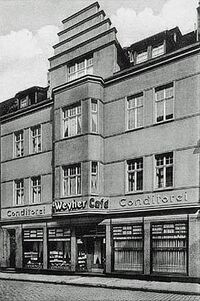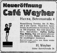 Weyhers erwarb das Gebäude und 1938 sind neben ihm (Betriebsführer a.D. Der Betreib wurde durch seine Frau Helene geborene Rudack[3] geführt) Leni und Matha Weyher dort gemeldet. Daneben sind folgende Personen im Adressbuch verzeichnet: Stütze Herta Dröse, Gewerbeoberlehrer (und ab 1942 Schwiegersohn Weyhers) Gottfried Jeuschede, Invalide Leopold Rudack[4] (Schwiegervater Weyhers), Konditorenmeister Otto Rumpf, Verkäuferin Herta Sbrzesny, Stadtoberinspektor a.D. Josef Veith[5] nebst Arbeitsvermittlerin Hanna, kauf. Gehilfe Herbert und den Versicherungsvertreter Josef Veith jun.