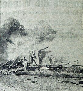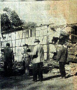 Am Dienstag erst äußerten HZ-Leser ihren Unmut darüber, daß der bereits seit Wochen verlassene Bergelmanns Hof noch immer nicht der Spitzhacke zum Opfer gefallen sei. Genau 24 Stunden später rückten Arbeiter einer Abbruchfirma an, um eines der ältesten Herner Häuser binnen weniger Stunden dem Erdboden gleichzumachen. Unsere Bilder zeigen von links nach rechts: Dicke Stahltrossen werden an zwei schweren Lastkraftwagen und an großen Haltebalken des Hauses befestigt. — Die Lkw rucken an, die Seile straffen sich, und die vordere Seitenwand stürzt in einer Wolke von Staub und Mörtel mit mächtigem Krachen und Bersten in sich zusammen. — Es dauert Minuten, bis sich der Staub des jahrhundertealten Gebälks verzogen hat, und ein riesiger Schuttberg darunter sichtbar wird. — Erst dann beginnen die Arbeiter damit, die Trümmer zu bergen und sorgfältig zu stapeln. — Zwei Stunden nur benötigte man für diese Arbeiten — dann bestand das einst so stolze Haus nur noch aus einem einzigen Trümmerhaufen. [2]