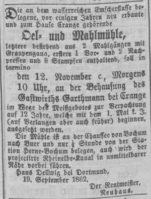 Die durch den Tod des Pächters pachtlos gewordene Cranger Mahl- und Sägemühle steht unter der Hand zu Verpachten. Die stets ausreihende Wasserkraft durch die Emscher, gute Kundschaft und sehr günstige Lage inmitten der Großindustrie ist bekannt. - Reflectanten wollen sich bei der unterzeichneten Verwaltung melden.