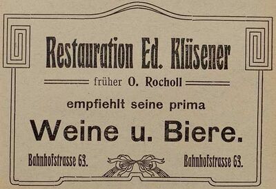 Sein Uhrmacherhandwerk legte er Anfang 1908 beiseite. In der Kölnischen Zeitung vom 10. Januar 1908 heißt es: „ Die in unserm Handelsregister A unter Nr. 120 eingetragene Firma"Ed. Klüsener", Herne, ist heute gelöscht worden. Herne, den 3. Januar 1908. 196 Königl. Amtsgericht“.[4] Nun führte er auf der Bahnhofstraße 63 eine Wirtschaft die er von den Erben Otto Rochol erworben hatte. Seit spätestens Anfang 1912 führte P. Braukmann das Restaurant und Eduard Klüsener setzte sich gesundheitsbedingt zur Ruhe. Eine langjährige Krankheit verhinderte weitere Aktivitäten.