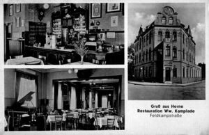 1925 firmierte hier August Kamplade. Dieser starb aber schon am 7. Juni 1925 mit 49 Jahren und dessen Witwe Anna geb. Bommeier und ihr Sohn Willy Kamplade führte das beliebte Lokal weiter. Das Lokal Kamplade wurde gerne für SPD und "Eiserne Front" Sitzungen genutzt.[1] In den späten 1930er und bis Kriegsende traf sich hier die NSDAP der Ortsgruppe Herne-Süd.[2][3] In den Jahren nach 1938 wechselte der Inhaber zu N. Schulte.