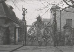 Die beiden Seitenpfeiler überragen deutlich die Tormitte. Das Flügeltor selbst wird durch ein fächerförmiges ornamentales Grundmuster zusammengehalten. Prägnant ist der durchlaufende Mittelstreifen, der in gleicher Breite wie die Seitenpfeiler erscheint. Aus einem Kübel aufsteigende Pflanzen tragen das Firmenschild mit den Initialen H.F. und Cie.