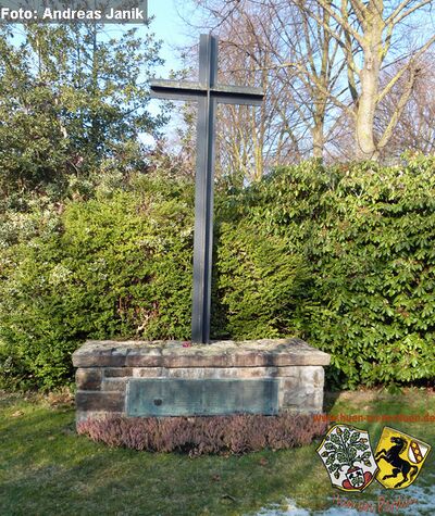 - Details: Der Gedenkstein besteht aus einem hohen Kreuz aus Stahl, welche auf einem langgestreckten Werksteinmonument stehen. Im Mittelteil ist eine Tafel angebracht. Hier sind namentlich 23 Opfer eines Grubenunglücks genannt, das sich am 10. Mai 1882 auf der Zeche Pluto ereignet hat. Die Form des Ehrenmals lässt vermuten, dass die Anlage in dieser schlichten Form erst weit nach 1882 errichtet wurde. Das Ehrenmal weist noch heute auf die Katastrophe hin. Es ist bedeutend für die Stadt Herne, weil es an die Bergbaugeschichte Hernes erinnert.