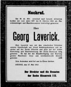 Der Herner Anzeiger berichtete darüber am 19. Mai 1913 und schrieb: „Laverick verkörperte in seiner Person den Typus des schlichten wackeren Bergmanns von echtem Schrott und Korn, den sein mehr als einhalbjahrhundert währender Aufenthalt in Westfalen und seine Heirat mit einer Tochter der roten Erde zu einem kerndeutschen Bergmann machten, der seine Kinder zu treuen Söhnen ihres neuen Vaterlandes erzog.“[4][5]