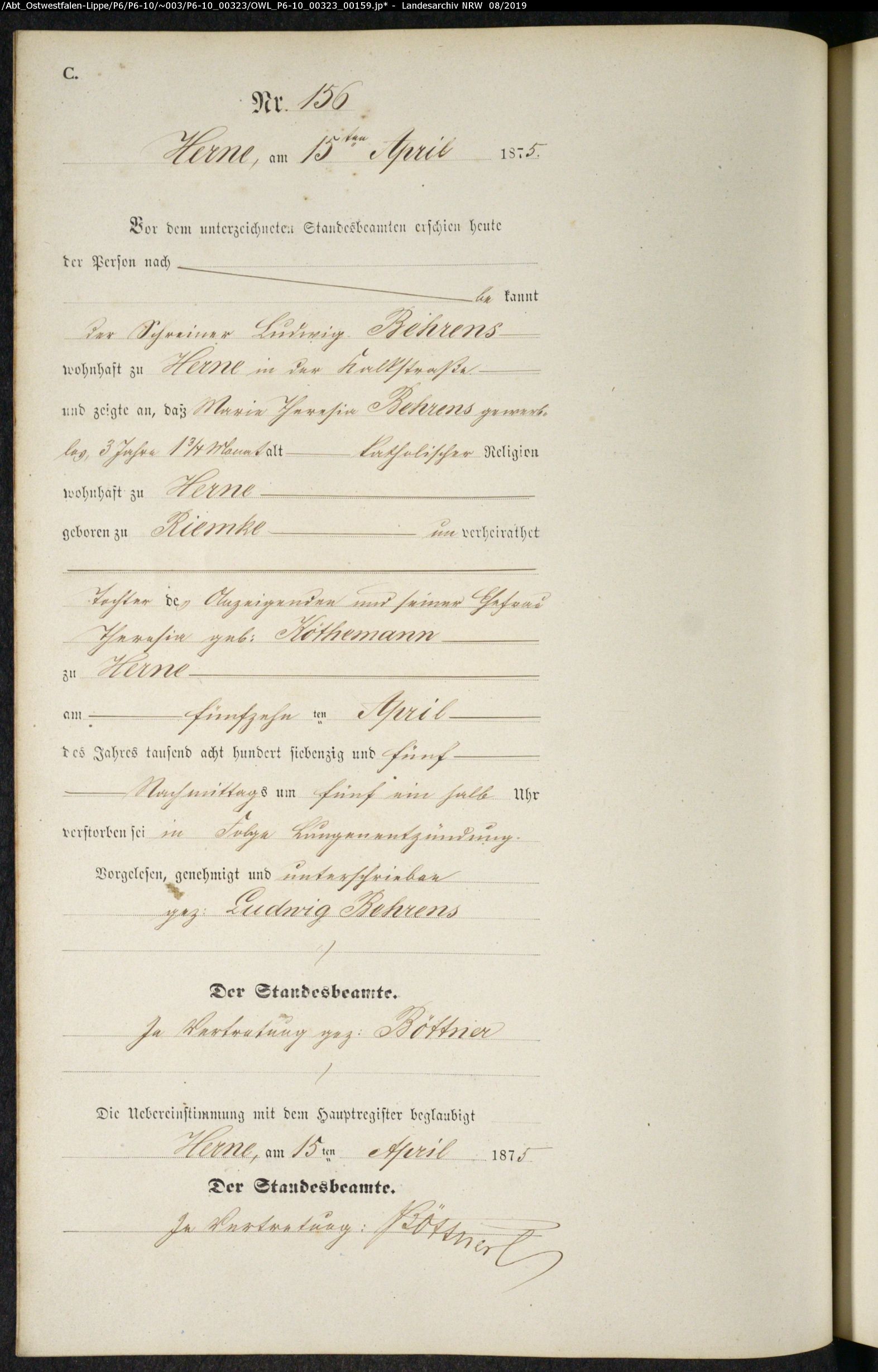 - ↑ Eine erste Nennung erfolgte schon am 15. April 1875 im Sterberegister Nr. 156