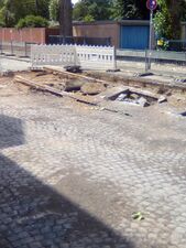 Bei Bauarbeiten am 10.06.2017 entdeckte Schienen der ehemaligen Straßenbahn auf der Hauptstraße in Richtung Dorf Crange.