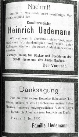 Heinrich Uedemann (* am 15. Oktober 1860 in Münster-Handorf, † 27. Juni 1905 in Herne, ± 29. Juni 1905 kath. Friedhof) war Konditormeister und wohne auf der Bahnhofstraße 81a.
