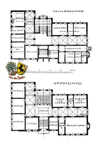 - Kellergeschoss: 3 Räume für die spätere Einrichtung der Chemieklassen, Schuldienerwohnung, Heizungsräume, Frisch-Luftkammern, für die Zuführung von frischer Luft zu den Klassenräumen und Kellerräume für den Schuldiener.