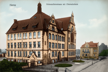 Nachdem sich in Herne die Notwendigkeit zum Ausbau der alten Rektoratschule zur Realschule mit Progymnasium ergehen hatte, und nachdem die nötigen Lehrkräfte für diese erweiterte Anstalt berufen waren, stellte sich das Bedürfnis nach einem neuen, geräumigen Schulgebäude heraus. Die städtischen Vertretungen fassten demgemäß Beschluss zum Ankauf des erforderlichen Bauplatzes, und zur Errichtung des Gebäudes. Eine zur Besichtigung auswärtiger Anstalten gewählte Kommission besichtigte Errichtung höheren Lehranstalten verschiedener Nachbarstädte. Hiernach wurden seitens des Stadtbauamtes die umfangreichen Vorarbeiten aufgenommen, eine Reihe von Grundrissen entworfen, von welchen im März 1902 durch das Kuratorium der Schule der in den beigefügten Zeichnungen dargestellte Grundriss zur Ausführung bestimmt wurde. Während des Sommers 1902 wurde dieses generelle Projekt ausgearbeitet, sodass die städtischen Vertretungen Ende Juni 1902 das definitive Bauprojekt genehmigen konnten, das dann auch die Genehmigung des Provinzial-Schulkollegiums erhielt. Nachdem so das Projekt festgelegt war, wurden während des Winters 1902 und 1903 die Detailpläne bearbeitet, sodass vorn 4. bis 29. Nov. 1902 die Fundamente des Gebäudes hergestellt und nach einer durch Frost verursachten Ruhepause, am 2. März 1903 die Arbeiten weitergeführt und zum 15. November 1903 fertiggestellt werden konnten.