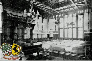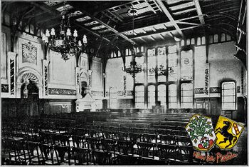 Eine reichere Ausbildung ist dem Repräsentations-Raume, der Aula, zu teil geworden. Diese hat eine Holzdecke in reicher Profilierung mit bemalten Putzflächen erhalten. Zwei Kronleuchter, sowie vier Wandarme in Schmiedeeisen mit Kupferverzierung sorgen für ergiebige Beleuchtung des Raumes. Durchbrochene Füllungen und Zwerggalerien vermitteln den Übergang von der Decke zu den Wänden, welche durch leichte Profile und ornamentierte Pilaster gegliedert sind. An der Südwand, in deren Mitte in einer Nische sich. die Büste unseres Kaisers auf hohem Postamente erhebt, flankieren links und rechts zwei in reicher Bildhauerarbeit ausgeführte Kamine aus poliertem Kalkstein, welche dem Raume als hervorragender Schmuck dienen. Das Hauptmoment in der Architektur der Nordwand bilden die drei Zugangstüren, welche durch eine vorgeschobene Galerie der Empore überdacht werden. Die Stützen dieser Empore sowie die Füllungen über den Türen sind in reicher Holzbildhauerarbeit gehalten. Die Ost- und Westwand nehmen die Fenster auf, welche in reichen Glasmalereien, die einerseits Kunst und Wissenschaft, anderseits Industrie und Handel darstellen, gehalten sind. In. zwei Meter Höhe haben die gesamten Wände Eichenholzpaneele in kräftigen Gliederungen erhalten. Die Wandflächen sind in elfenbeinfarbigem Ton abgetönt und werden in angenehmer Form durch einen umlaufenden farbigen Fries unterbrochen; auch trägt die naturalistische Behandlung der Pilasterfüllungen zu einer glücklichen Farbenstimmung bei. Der gesamte Eindruck darf als eine würdiger und den Zwecken des Raumes angepasster, bezeichnet werden.