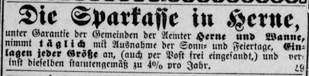 Die Sparkasse Herne wurde schon am 24. August 1860[1] ins Leben gerufen und als öffentliche Sparkasse am 1. Januar 1867 gegründet. Ein Zeitungsinserat kündigte den Beginn des Geschäftsbetriebs an – unterzeichnet vom Ehren-Amtmann von Forell. Die Eröffnung fand ohne große Feier statt und erfolgte in einfachen Räumlichkeiten in der Schulstraße 3, verwaltet von Wilhelm Sprick, dem ersten Rendanten. Bereits im ersten Jahr wurden 172 Konten mit einem Einlagenbestand von 82 283 Talern, 10 Silbergroschen und 5 Pfennigen geführt.[2][3]