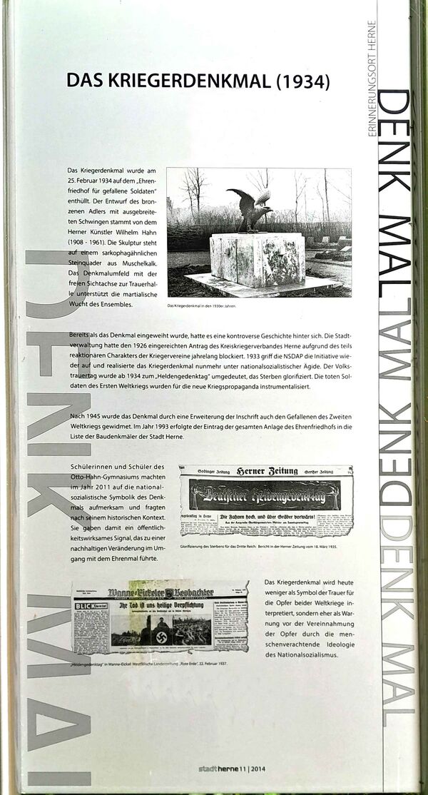 Die Infotafel zum Kriegerdenkmal von 1934 auf dem Hauptfriedhof Herne wurde 2015 aufgestellt, um das Denkmal historisch einzuordnen und kritisch zu kommentieren. Anlass war eine Initiative von Schülerinnen und Schülern des Otto-Hahn-Gymnasiums, die auf die propagandistische Dimension des Denkmals aus der NS-Zeit hinwiesen.