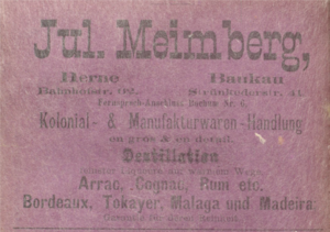 Meimberg eröffnete an der Wiescherstraße sein Handelsgeschäft mit “Kolonialwaren und Landesprodukten en gros et en detail”.