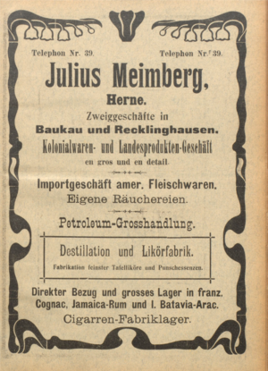 Am 1. März 1873 gründet er mit dem Kaufmann Heinrich Klappert in Herne die offene Handelsgesellschaft Klappert & Meimberg. Gleichwohl wurde unter der Nummer 263 die Firma „Julius Meimberg“ und als deren Inhaber der Kaufmann Julius Meimberg ins Handelsregister eingetragen.[2] Schon am 3. November 1873 wurde die Gesellschaft Klappert & Meimberg wieder gelöscht. [3]