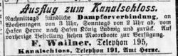 "Geht man vom Hebewerk 5/4 Std. weiter, so gelangt man zum Kanalschloss, welches von herrlichen Buchen- und Eichenwald umgeben ist. Das Kanalschloss bietet schöne Räume und ist mit allem Konfort der Neuzeit ausgestattet. Der Besitzer, Herr Wallner, sorgt für vorzügliche Verpflegung. Bequemer kammt man nach dem Kanalschloss, wenn man mit der EIsenbahn bis Herne fährt. Vom Bahnhof bis zum Hafen sind 5 Min. Dann kann man mit dem Personendampfer in 22 Min. nach dem Hafen König Ludwig fahren, woselbst das Kanalschloss liegt."[4]
