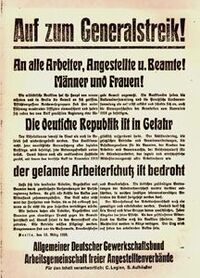 Am 13. März 1920 putschten unter Führung des preußischen Oberregierungsrats Kapp und des Generals Lüttwitz die Reichswehr und marodierende Freikorpseinheiten in Berlin gegen die Ergebnisse der Novemberrevolution (1918/19) und die junge Weimarer Republik. Die Reichsregierung unter Friedrich Ebert (SPD) flüchtete zunächst nach Dresden und dann nach Stuttgart. Gewerkschaften, SPD, USPD und KPD riefen zur Verteidigung der Republik und der ersten parlamentarischen Demokratie in der deutschen Geschichte zum Generalstreik auf. Ab 15. März 1920 befanden sich über 12 Millionen Arbeiter, Angestellte und Beamte im Streik.