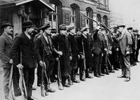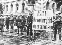 Bewaffnete Arbeiterwehren wurden aufgestellt. In vielen Teilen Deutschlands, besonders aber hier im Industrierevier, wo sich eine 100tausend Mann starke >Rote Ruhrarmee< gebildet hatte lieferten sich die Arbeiter mit der äußerst brutal vorgehenden Soldateska zum Teil erbitterte, bewaffnete Kämpfe. Zunächst war der Generalstreik erfolgreich, die Reichswehr- und Freikorpseinheiten wurden zurückgeschlagen oder zur Kapitulation gezwungen. Der Putsch wurde vereitelt und die Republik gerettet. Es ging der Streikbewegung aber nicht nur um die Abwehr des Putsches sondern auch um die in der Novemberrevolution 1918/19 verfehlte, konsequente Sozialisierung von Wirtschaft und Gesellschaft. Gegen diese Bestrebungen wurden nunmehr von der gerade geretteten Regierung, Reichswehr und Freikorpseinheiten (darunter Teile der Putschtruppen) in Marsch gesetzt. Das Militär nahm in den folgenden Tagen und Wochen blutige Rache an den kämpfenden Arbeitern.