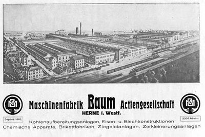 Die Maschinenfabrik Baum wurde Mitte 1883 von Kommerzienrat Fritz Baum (1852–1906) in Herne gegründet. Ab dem 21. Oktober/15. November 1905 firmierte sie unter dem Namen Maschinenfabrik Baum Aktiengesellschaft, später als Teil der Schüchtermann & Kremer‑Baum AG mit Sitz in Herne‑Herne‑Nord[1].
