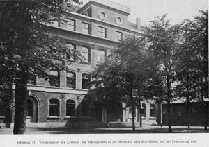 Einen weiteren Ausbau erlebte die Schule - immer wieder durch die erhöhte Schülerinnenzahl benötigt - 1906. Am 23. Mai 1906 erteilte die Stadtverordnetenversammlung die Genehmigung zum erweiterten Ausbau für 135.000 Mark. Das Gebäude wurde um zwei Stockwerke erhöht, ein Anbau nach Westen gesetzt und in nördlicher Richtung eine Turnhalle mit darüber liegenden Aula errichtet. Es gab nun neun Klassenräume, ein kleiner Raum für den Religionsunterricht, Ein Physikraum, Zeichensaal, Direktorenzimmer, Lehrerzimmer, Bücherei, Krankenzimmer, die Turnhalle, Aula und eine Hausmeisterwohnung im Dach[2]. Die leitenden Bauleiter waren, Baurat Piehl und Karl Kurzreuther.