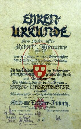 Ernennungsurkunde zum Ehren-Obermeister. Quelle: Archiv der Kreishandwerkerschaft Herne