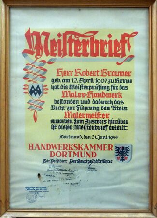 Zweitausfertigung des Meisterbriefes Robert Brauners. Quelle: Archiv der Kreishandwerkerschaft Herne.