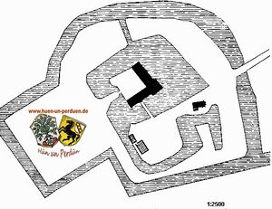 Das heutige Hauptschloss besteht aus Resten einer kastellartig geschlossenen Anlage, die früher in der Mitte eines ovalen Schlossteichs stand. Sie umfasste vermutlich nur einen wehrhaften Wohnturm und ein Torhaus. Eine Vorburg war ihr südlich davon auf einer eigenen, zweiten Insel vorgelagert. Die Anlage, deren Kernburgareal etwa 45 Meter mal 45 Meter einnahm, war von einem komplexen Gräftensystem und einer doppelten Wallanlage geschützt. Abgeschlossen wurde die gesamte Anlage vermutlich von einem Wehrgang im Westen.