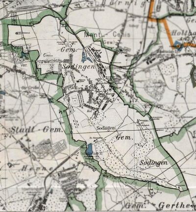 - Herne-Sodingen - Westlich von der Schmedebecke gelegen, bildeten vier große Bauernhöfe - Schmidt, Schulte-Sodingen, Böcker und Spithaut diese Siedlung. Der untergegangene Adelssitz Haus Sodingen lag ebenfalls hier.[4]