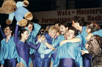 15 Mannschaften traten am 31. Oktober 1987 an, die Wanne-Eickeler Formation allerdings mit 2.000 begeisterten Zuschauern im Rücken. Nach fast fünf Stunden flossen dann die Tränen und Wanne-Eickel hob ab: Weltmeister vor heimischem Publikum! Gefeiert wurde außerhalb. Im Herner Kulturzentrum bat Oberbürgermeister Willi Pohlmann zum Sektempfang (damals war der OB noch fürs Feiern zuständig) und die Wanner waren in dieser Nacht sicherlich die glücklichsten Menschen zwischen Ruhr und Emscher. Bis auf Martina Schumacher. Der Pechvogel der Formation hatte sich zwei Tage vor der deutschen Meisterschaft den Mittelfuß gebrochen. Ersatzfrau Stefanie Ringler ließ aber während der Wettkämpfe nichts anbrennen.