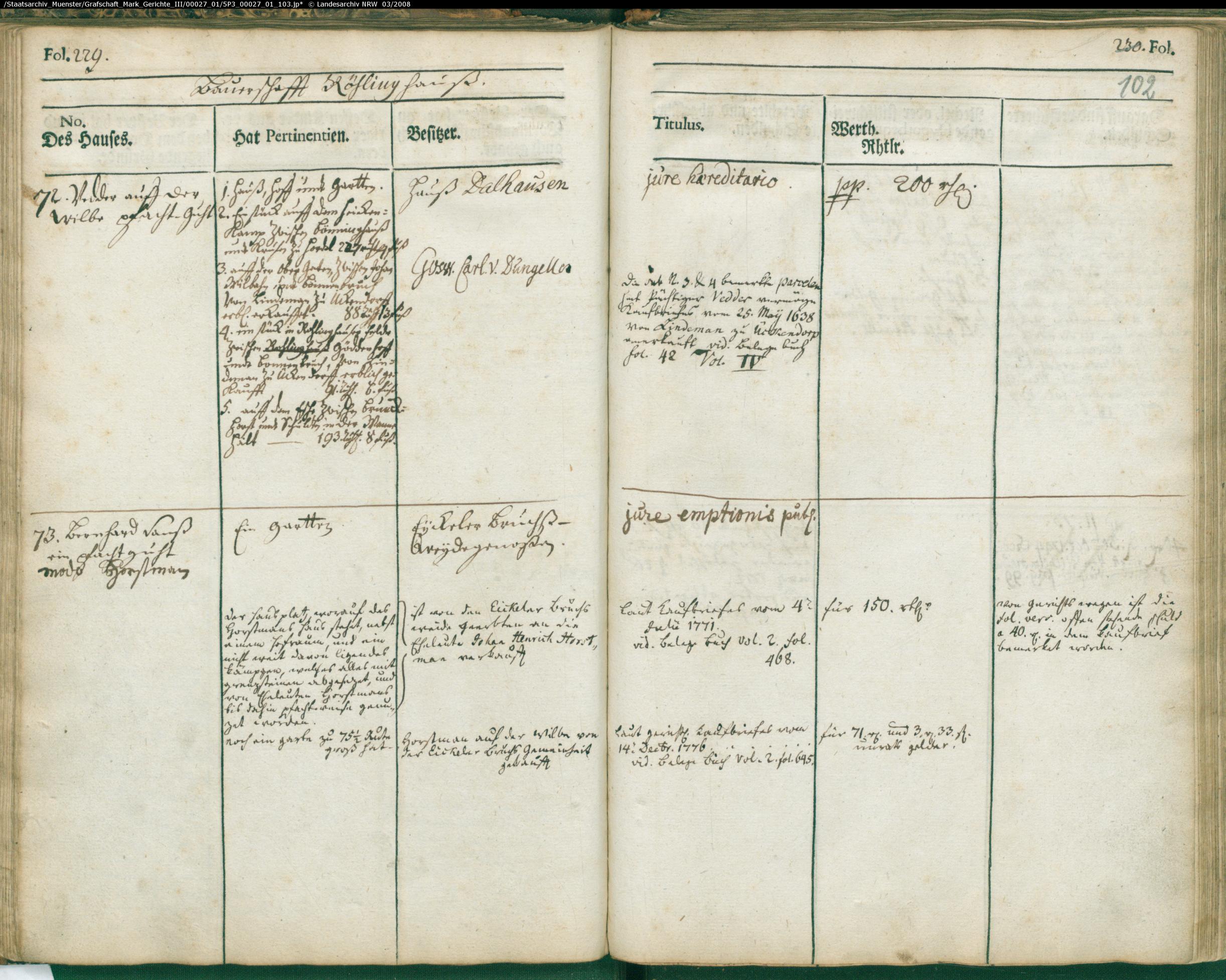 Das Gericht bestätigt, Bochum im Gericht Eickel, den 1. Mai 1790, die Eintragung des Kaufbriefes auf den Namen der Wittib und Kinder Vedder in das Grund- und Hypothekenbuch des Gerichts Eickel unter der Bauerschaft Röhlinghausen sub Nr. 72 fol. 230. Originaleintrag Direktlink