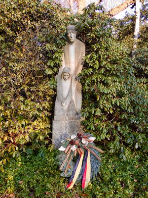 - Vis-à-vis der Trauerhalle und zur Rechten des Zugangs zum Ehrenfriedhof für die deutschen Soldaten steht das Mahnmal für die Gefallenen der beiden Weltkriege. Die auf einem ein Meter hohen Sockel aufstehende, 2,20 Meter hohe Skulptur Die Klage schuf der Bildhauer Hubert Hartmann aus Thüster Muschelkalk. Enthüllt wurde sie am 18. November 1960. Im Vordergrund eine kniende Frau, die Trauernd ihre Hände im Schoß faltet und hinter ihr stehend ein Mann, der schützend seine Hände auf ihre Schulter legt.[20]