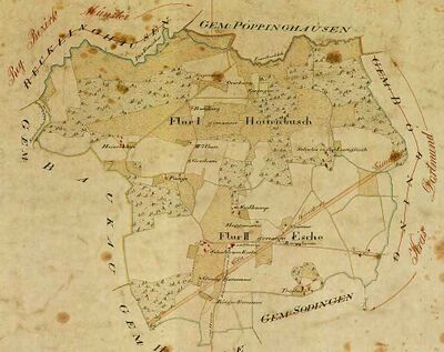 sind, sorgfältig aufbewahrt und sehr gut erhalten, eine Übersichtskarte im Maßstab 1:10 000 und zwei frühere Karten im Maßstab 1:2500 vorhanden. Die beiden Flure von Horsthausen führen die Bezeichnung „I, genannt Höttenbusch“, „II, genannt Esche". Die Grenzen von Horsthausen haben sich durch die Bebauung gerade so gut verwischt, wie die Grenzen aller anderen kleinen Gemeinden auch. Es sind zwar immer noch dieselben Grenzen wie früher, und wessen Grundstück an der Grenze liegt, ist fast allein sich über deren Verlauf klar.
