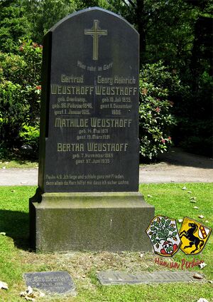 1. Elisabeth Lisette "Bertha" WEUSTHOFF, Evangelisch geboren am 07.11.1869 in Herne Nordrhein-Westfalen Deutschland. getauft am 17.12.1869 in Herne Nordrhein-Westfalen Deutschland St. Dionysius Herne (Dorfkirche). gestorben am 27.06.1935. begraben in Herne Nordrhein-Westfalen Deutschland Südfriedhof. 2. Mathilde WEUSTHOFF geboren am 14.05.1871. getauft am 27.06.1871 in Herne Nordrhein-Westfalen Deutschland. gestorben am 19.03.1921. 3. Martha WEUSTHOFF geboren am 26.05.1873. getauft am 04.07.1873 in Herne Nordrhein-Westfalen Deutschland