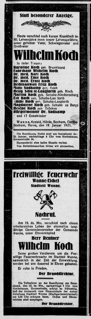 - Wanne-Eickler Zeitung vom 21. Januar 1927. "Zu Wilhelm´s Koch Tod" online auf Zeitpunkt.nrw