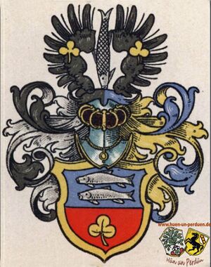 - Im geteilten Schild oben in Blau zwei silberne Forellen unten in Rot ein goldenes Kleeblatt. Auf dem Helm eine silberne Forelle zwischen zwei schwarze, mit je einem Kleeblatt belegten Adlerflügel. Die decken sind rechts Schwarz/Silber, Rechts Blau/Gold. Verleihen wurde es -erst - im Jahre 1806.