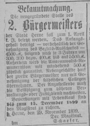 [[Datei:Kölnische Zeitung mit Wirtschafts- und Handelsblatt (2 12 1899) 945 946 947 Köln.png|mini|Stellenanzeige zum 2. Bürgermeister aus der Kölner Zeitung vom 2. Dezember 1899]] |
