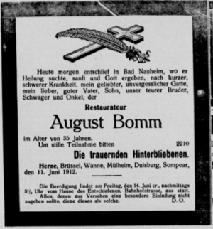 [[Datei:Herner Anzeiger (12.6.1912) 134. Bomm.png|mini|links|<small>Traueranzeige für August Bomm aus dem Herner Anzeiger vom 12. Juni 1912.</small>]] |