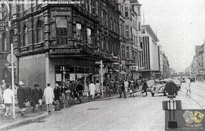 | ⚫ | 1895 kam das Eckgrundstück an den Kaufmann Moritz Gans (Bahnhofstraße 57). Schon 1892 ist er als Kaufmann im Haus Bahnhofstraße 57 im Adressbuch eingetragen. Hier betrieb er bis 1938 ein "Warenhaus für Konfektionen und Textilwaren". Dessen bewegende Geschichte und Schicksal in der NS-Diktatur wird vielfältig beschrieben und zurecht gedacht. |
