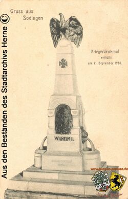 | Dieser Artikel beschäftigt sich mit dem Kriegerdenkmal in Sodingen, zu diesem Thema gibt es auch noch die Artikel Denkmal zur Erinnerung an den Bergbau in Sodingen und Der Platz am Denkmal in Sodingen. |