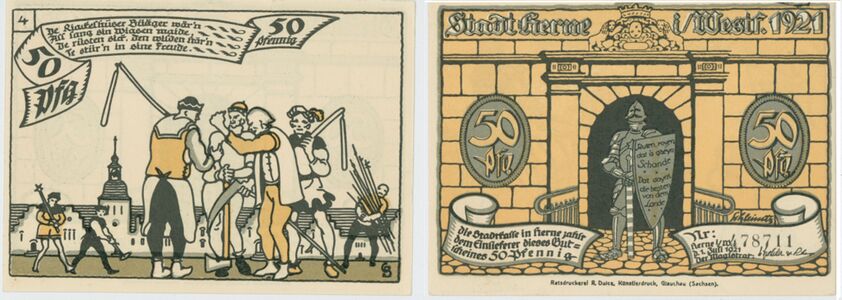 Die Herner Stadtverwaltung konnte sich in dieser Zeit vor eilfertigen Angeboten umliegender Druckereien, die ihre Klischee- und Druckkünste anpriesen, kaum retten. Tagtäglich flatterten Rechnungen in die Amtsstuben. Pro Stück zahlte Herne beispielsweise 3.850 Mark bei einer Dortmunder Druckerei für die in Auftrag gegebenen 500000 Mark-Scheine. Bemühte man sich zunächst darum, dem Notgeld zumindest äußerlich den Anschein eines Zahlungsmittels zu geben, blieb dafür später keine Zeit mehr: In krakeligen Druckbuchstaben erinnerte die Stadt am Rand der Geldscheine daran, daß dieser einen Monat nach Aufruf seine Gültigkeit verliert.