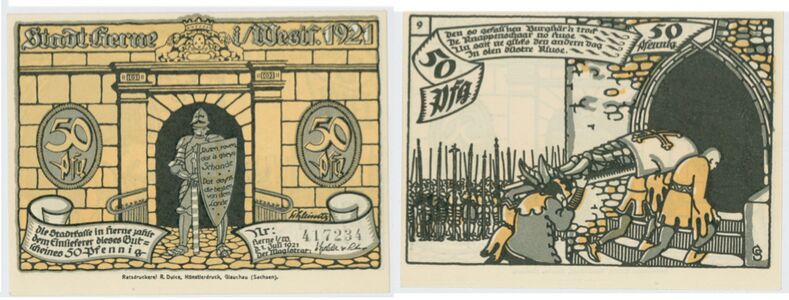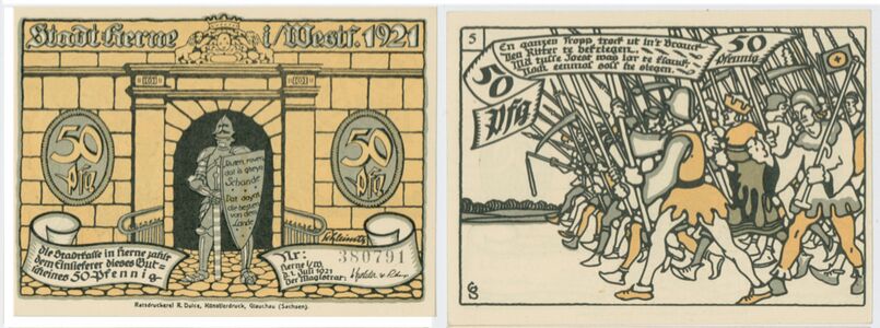 Im Gleichschritt mit anderen Städten behoben die Herner Stadtväter und die Ämter Wanne, Eickel und Sodingen den akuten Geldmangel kurzerhand mit stets druckfrischem eigenen Geld: Die Inflation war um einen bunten, schillernden Paradiesvogel reicher: Städtisches Notgeld.
