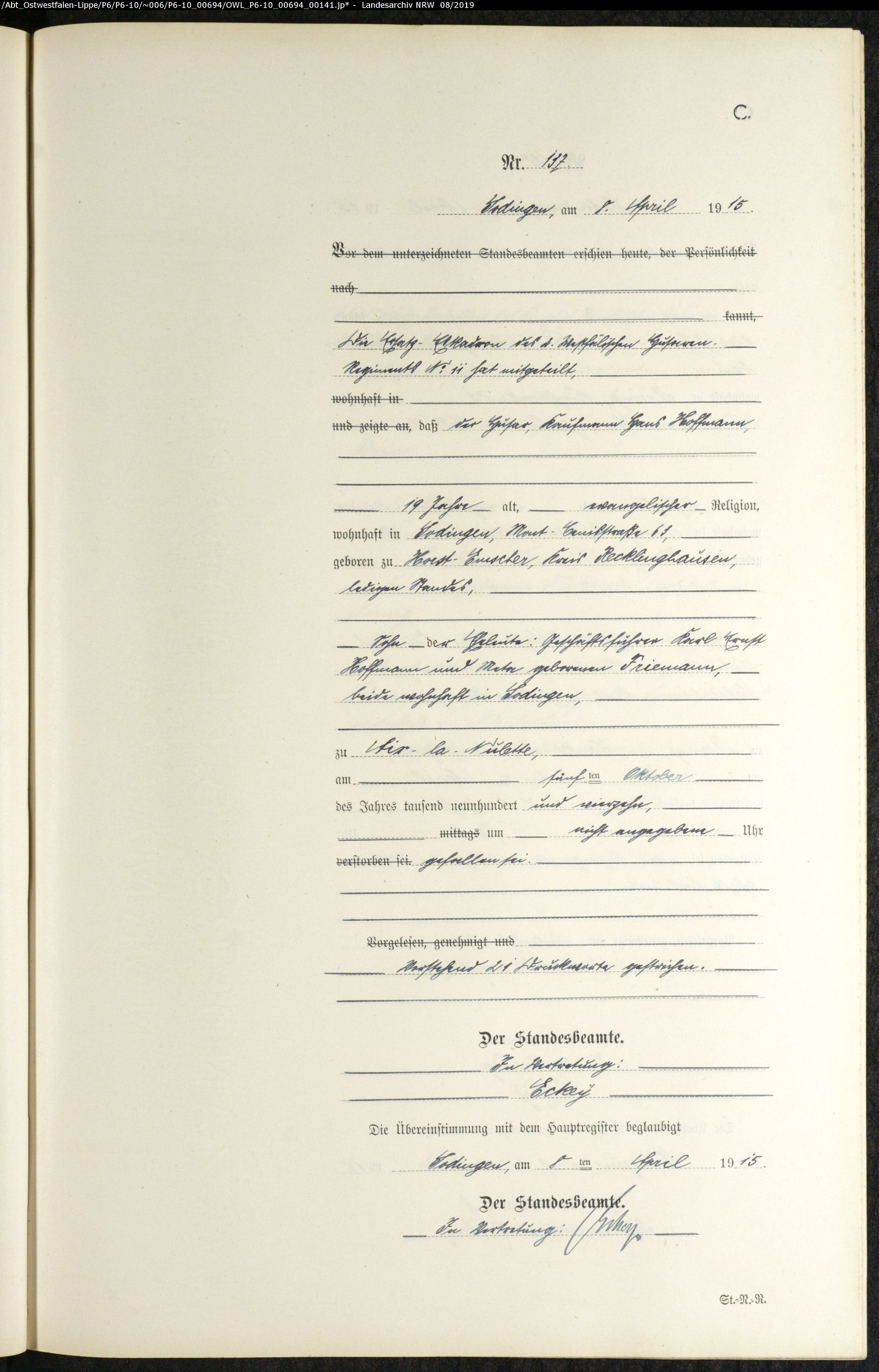 - Hans Hoffmann, * 14. Oktober 1894 Horst-Emscher, ~ 22. November 1894 [4] Haustaufe , X 05. Oktober 1914 Aix-la-Nulette [5] [6], ± Langemark, Belgien, Soldatenfriedhof Block A Grab 7115.