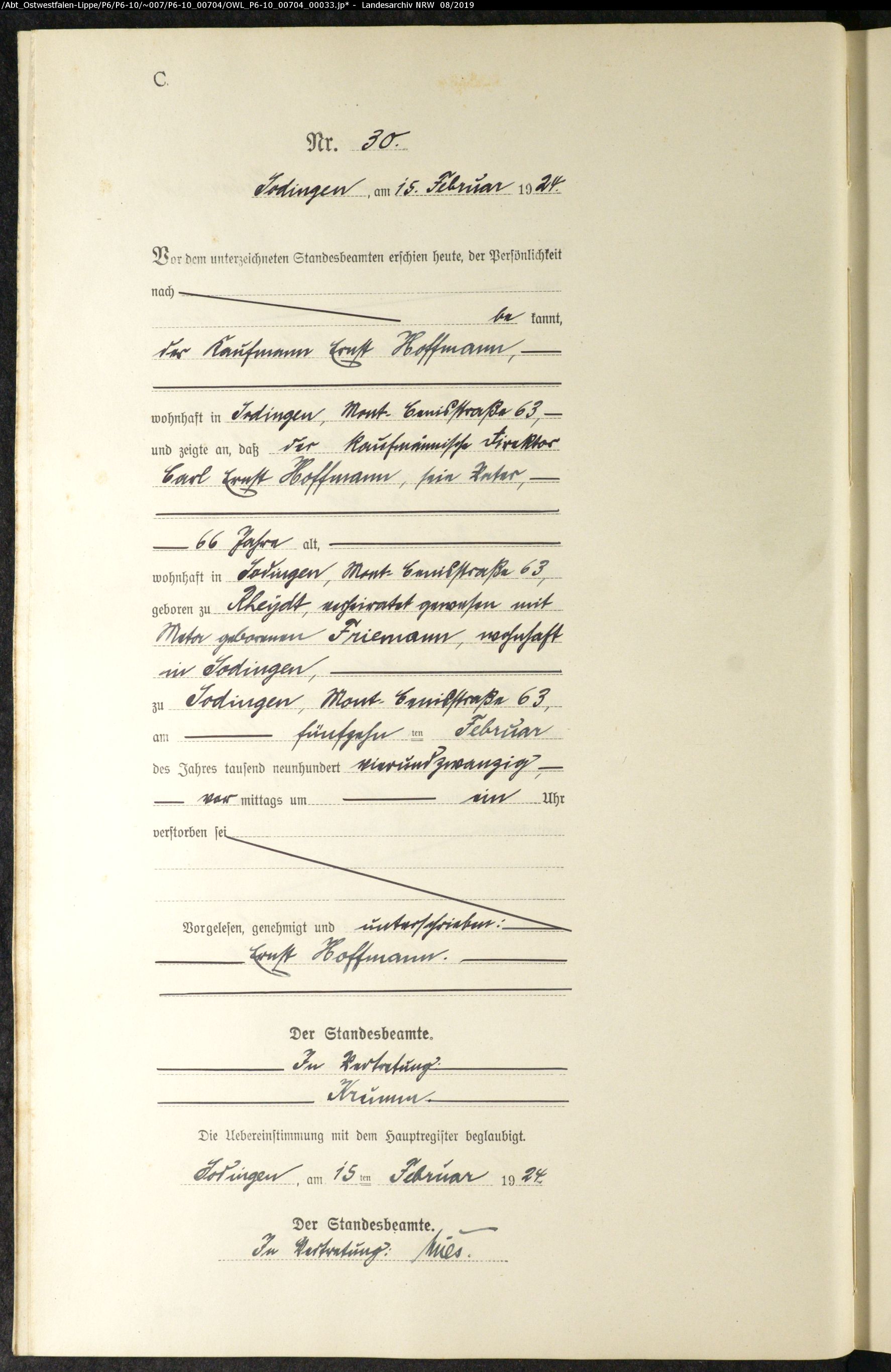 - Ernst Hoffmann, * 04. April 1897 Gelsenkirchen-Horst, ~ 27. Mai 1897[7] Haustaufe, Kaufmann