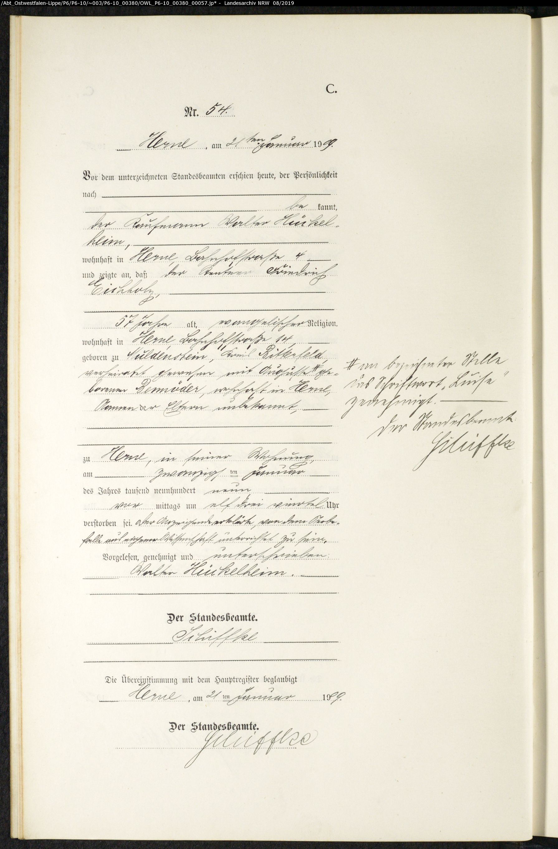 - ↑ Sterberegister des Standesamts Herne Nr. 54/1909. Online auf Archive.nrw