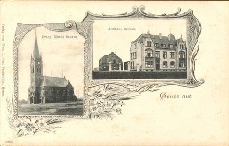 Die Seite wurde neu angelegt: „450px|thumb|Amtshaus Baukau, Sergeantenhaus, ev. Kirche, 1902 Im Jahr 1900 zählte das Amt Baukau u…“ |